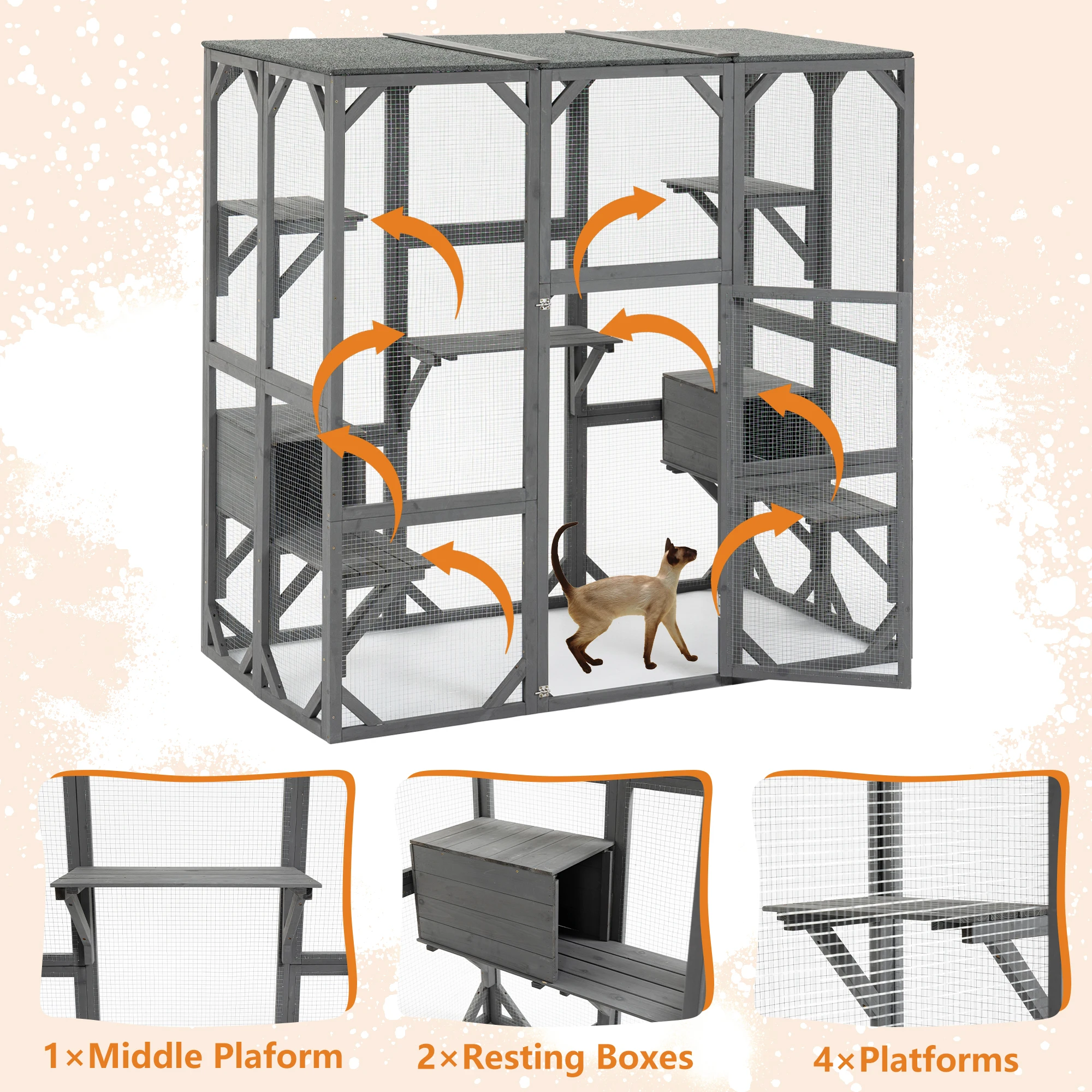71″×37″×71″ Outdoor Cat House Wooden Catio Enclosure w/Cover- Large Cat Cage with Jump Platforms and Condos, Weatherproof, Grey