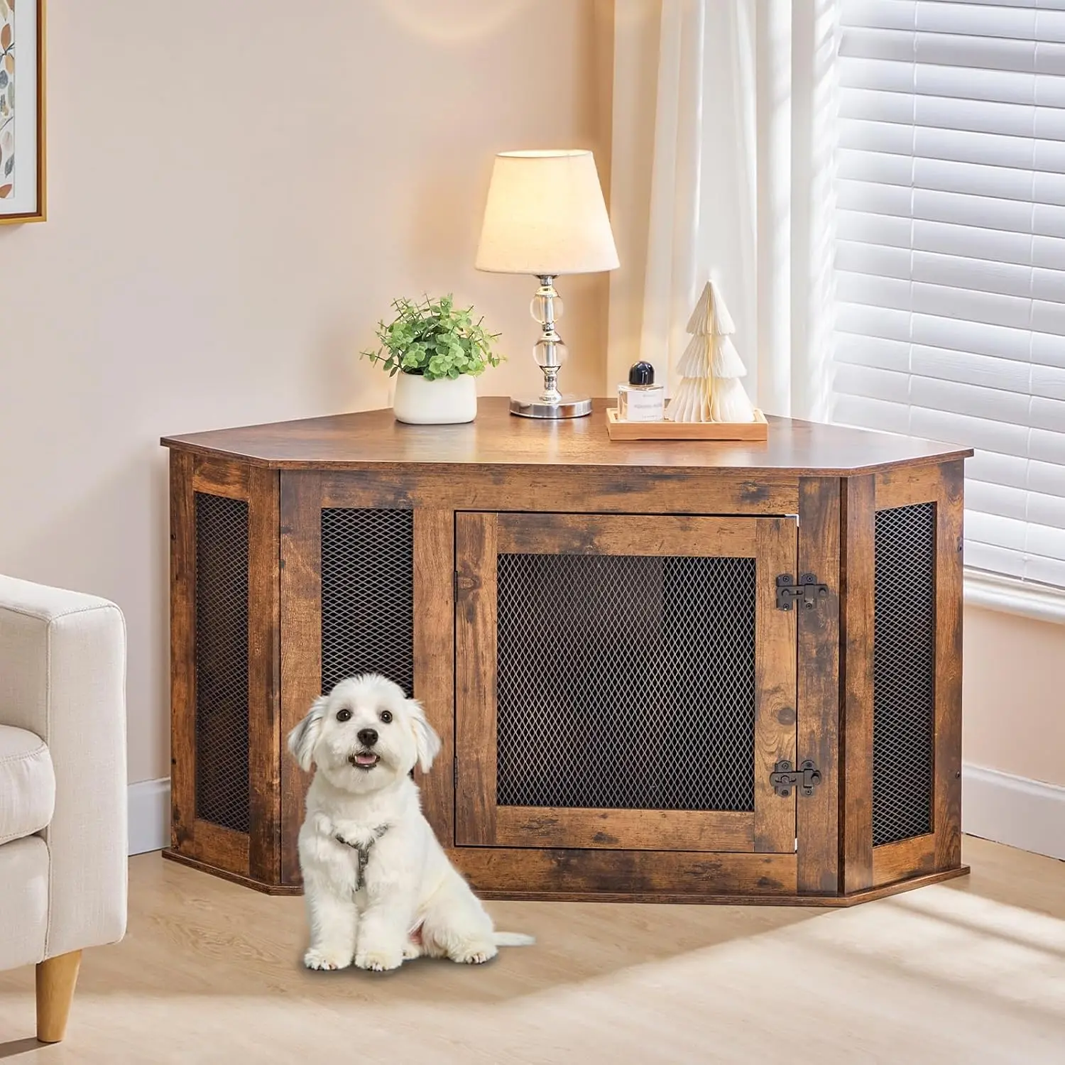 Wooden Corner Dog Crate Furniture (AliExpress) – Rustic brown multifunctional corner kennel that doubles as a decorative side table.